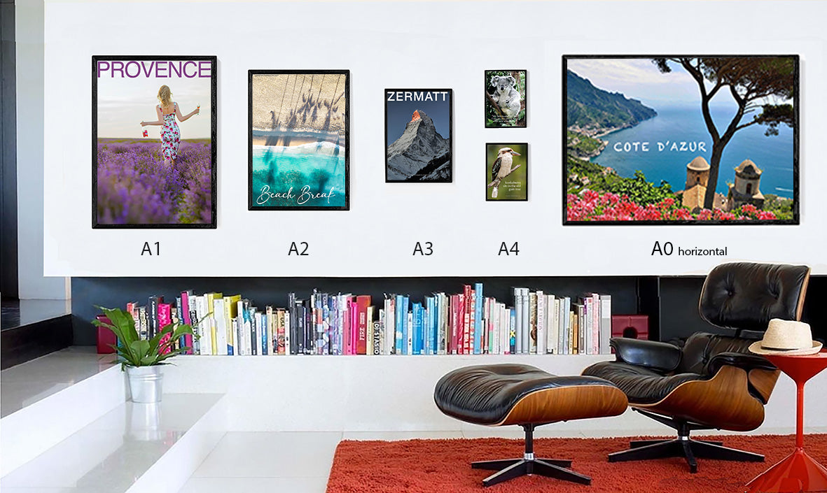 Explore our colourful Wall Art Collection. Use this Size Guide (left) to imagine our various poster sizes on your wall.